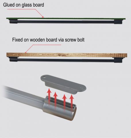 First, Mark the installation position of bases of LUA8428-1 in your display showcase at first. Then adhere two bases on the glass board using shadow-less glue/or fix two bases on wooden board using screw bolt.
